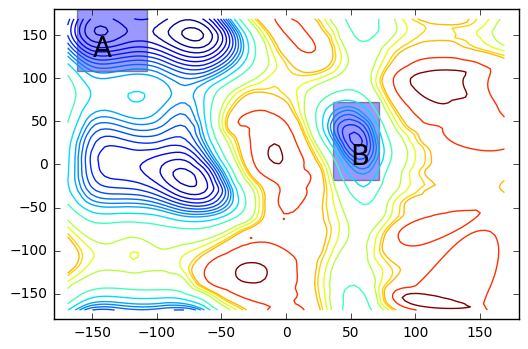 Then we compute the stationary vector and the corresponding free energy (potential of mean force) and plot contour lines of the free energy. For plotting purposes we extrapolate the values on those grid centers belonging to the largest connected set to a fine grid. There might be some artifacts because the extrapolation is not aware of the \((\phi, \psi)\)-periodicity and because of missing values outside of the largest connected set.