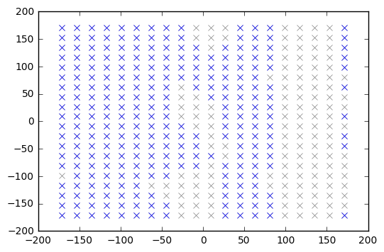 plt.plot(centers[lcc, 0], centers[lcc, 1], ls=' ', marker='x', c='b')