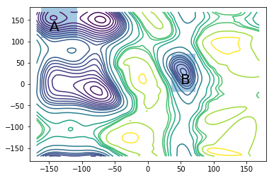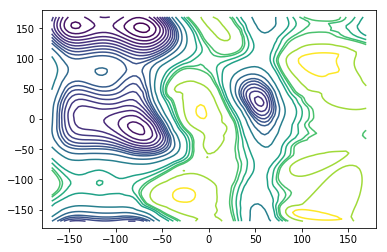 Then we compute the stationary vector and the corresponding free energy (potential of mean force) and plot contour lines of the free energy. For plotting purposes we extrapolate the values on those grid centers belonging to the largest connected set to a fine grid. There might be some artifacts because the extrapolation is not aware of the \((\phi, \psi)\)-periodicity and because of missing values outside of the largest connected set.