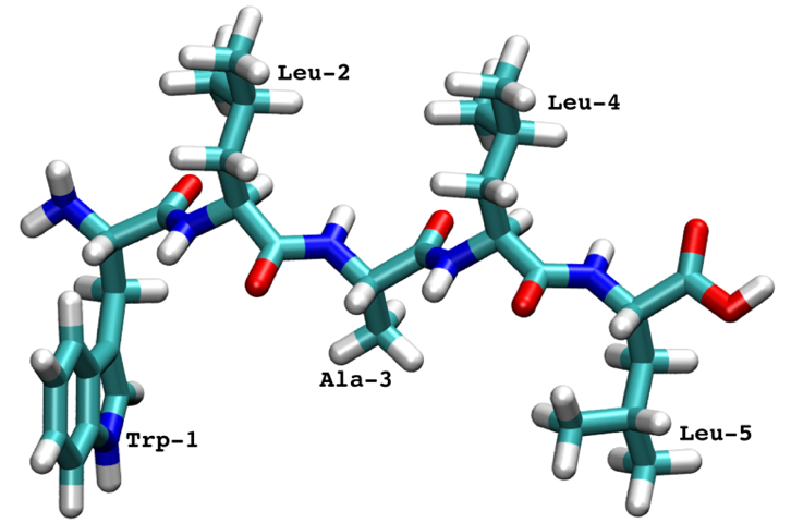 The pentapeptide was simulated with implicit solvent and the trajectories were saved with a \(0.1\) ns timestep.