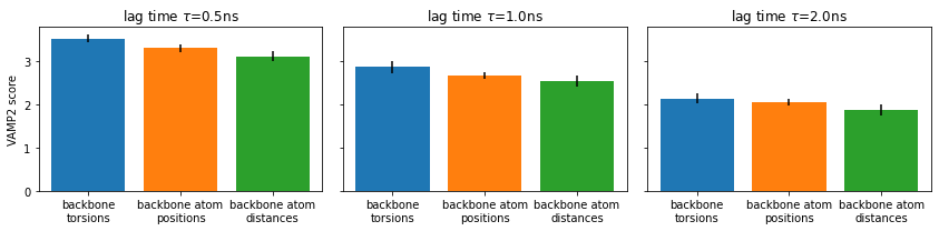 We will now rank the three featurizations by means of the VAMP2 score which measures the kinetic variance contained in these features mcgibbon-15, wu-17, mardt-17. The minimum value of this score is \(1\), which corresponds to the invariant measure or equilibrium.