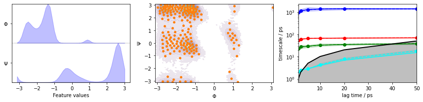 In this notebook, we will cover how to estimate a Markov state model (MSM) and do model validation; we also show how to save and restore model and estimator objects. For this notebook, you need to know how to do data loading/visualization (Notebook 01 ➜ 📓) as well as dimension reduction (Notebook 02 ➜ 📓).